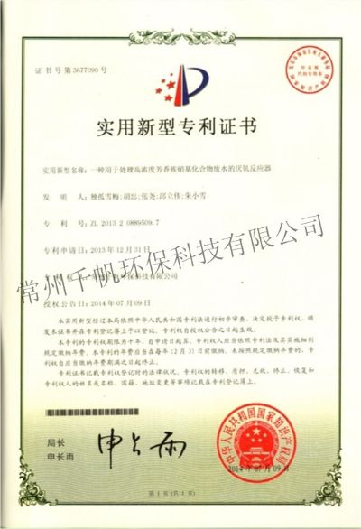 實(shí)用新型專(zhuān)利證書(shū) 一種用于處理高濃度芳香族硝基化合物廢水的厭氧反應(yīng)器