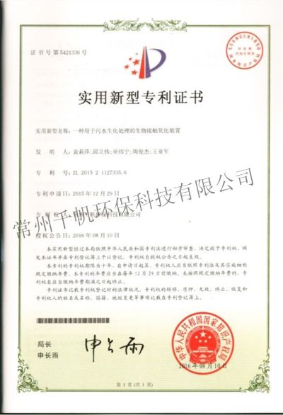 實(shí)用新型專(zhuān)利證書(shū) 一種用于污水生化處理的生物接觸氧化裝置