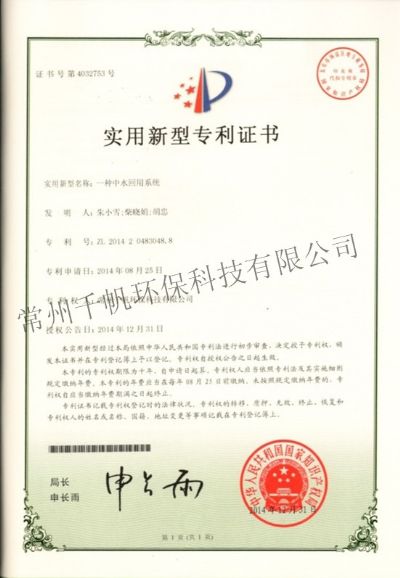 實(shí)用新型專(zhuān)利證書(shū) 一種中水回用系統(tǒng)