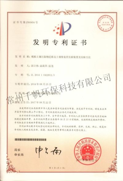 發(fā)明專(zhuān)利證書(shū) 模擬土壤污染物遷移及土壤修復(fù)的實(shí)驗(yàn)裝置及實(shí)驗(yàn)方法