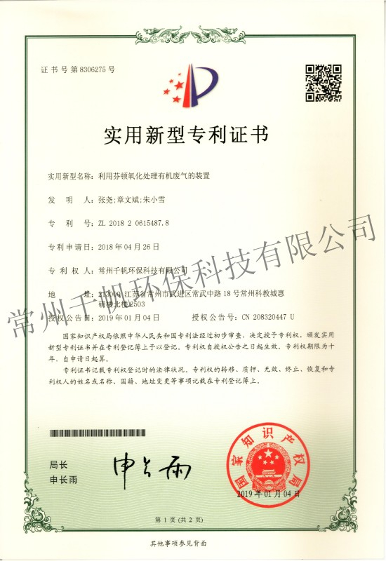 實(shí)用新型專(zhuān)利證書(shū) 利用芬頓氧化處理有機(jī)廢氣的裝置