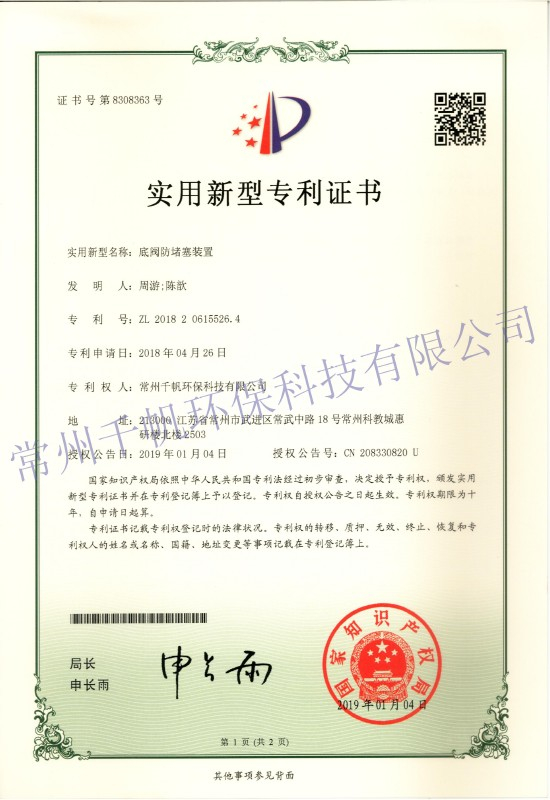 實(shí)用新型專(zhuān)利證書(shū) 底閥防堵塞裝置
