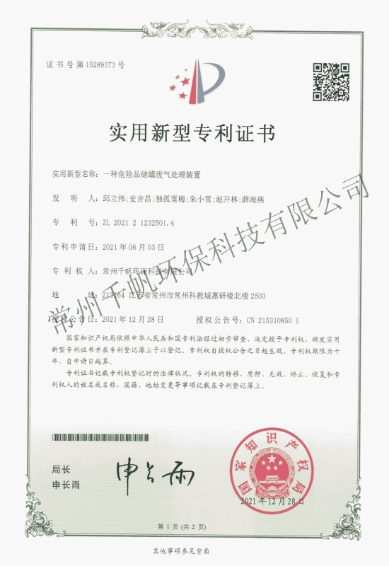 實(shí)用新型專(zhuān)利證書(shū) 一種危險(xiǎn)品儲(chǔ)罐廢氣處理裝置
