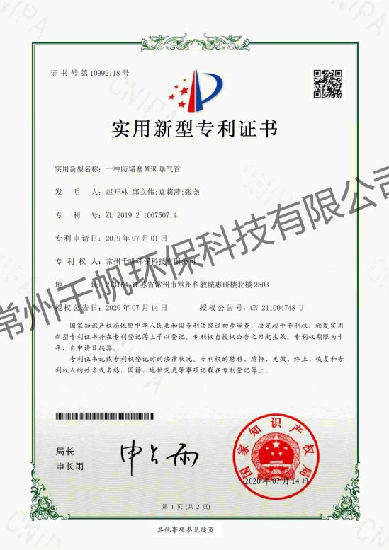 實(shí)用新型專(zhuān)利證書(shū) 一種防堵塞MBR曝氣管